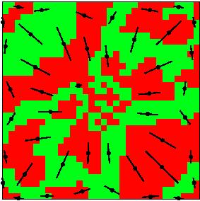 When the visuotopic map is uniform small circles in visual space are represented by small circles on the cortex. In general, however, the visuotopic map is not completely isotropic and transforms small circles in visual space into ellipses on the cortex. The major axes of the ellipses define the local directions in which the visuotopic map is most stretched. Recent optical imaging measurements by Blasdel suggest that the boundaries of ocular dominance columns in monkeys run perpendicular to this direction of maximum stretch. In order to investigate this effect, an optimisation calculation was performed in which the distribution of receptive fields was set up so that the visuotopic map would be anisotropic. The final configuration is shown in the picture. Red and green code neurons responding to left and right eye stimulation. The direction and magnitude of maximum stretch in the visuotopic map for the final configuration was calculated, and is shown by orientation and length of the black and red lines. In the optimised layout the ocular dominance column boundaries are approximately perpendicular to the stretch in the retinotopic map. Although the simulation is crude it concurs qualitatively with Blasdel's measurements and suggests an explanation for the phenomenon. Young and Scannell give an interesting review of instances in which biological wiring length is not minimised. |