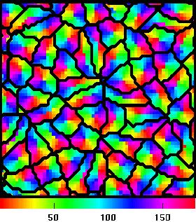 This picture shows the result of a simulation of a small patch of cortex whose neurons are selective for orientation as well as having different receptive field locations. The computation, which started from a random configuration of cortical neurons, involved 8 x 8 "retinal neurons" which projected to 64 x 64 "cortical neurons". The picture shows the orientation preference (between 0 and 180 degrees) of the neuron at each location. The orientation map is not as regular as experimentally observed configurations, but it consists of pinwheels. The superimposed black lines delineate regions in which the receptive field locations are similar. In each of these regions the orientation preferences are arranged as a single pinwheel, so they might be regarded as the analogues of hypercolumns, since each one contains the necessary machinery to process the full range of orientations for a particular point in visual space. Ocular dominance columns and cortical shear