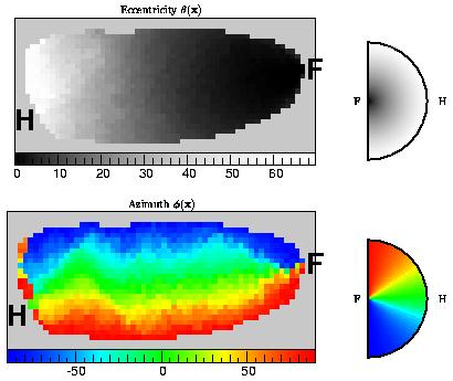 The figure shows a simulation of the visuotopic map of macaque V1. The computational "V1" is approximately the shape of flattened macaque V1. The shows the optimum configuration of cortical neurons found after simulated annealing from a random initial configuration. The left panel is a map of the eccentricity of each cortical neuron's receptive field (shown as a gray scale), and the bottom panel shows the azimuthal angle on a color scale. Thus the receptive field location of a particular computational "neuron" is obtained by reading the eccentricity from the top panel and the azimuthal angle from the bottom panel. Neurons shaded dark gray have receptive fields lying close to the fovea, while those drawn in white look at peripheral regions out to about 70 degrees. The amount of cortex devoted to foveal regions is apparent from the amount of dark gray in the picture. The distribution of eccentricities was chosen so that the cortical magnification factor obeys the measured form. The position of the foveal representation (F), at the far left hand of V1 is in the right place, as is the approximate location of the horizontal meridian, which ends at H on the far right. In common with real V1, the peripheral regions of the hemifield are represented around the edges of the computational V1. It should also be noted that the map is smooth. Although this was not built into the mode: it would have been possible for the map to have been discontinuous. In the optimum configuration neurons with nearby receptive fields are placed close together, and it is efficient to place neurons with distant receptive fields far apart on the cortex. The inefficiency for this optimized layout was 323, compared with 630 for the mean of 10 random configurations. Orientation pinwheels