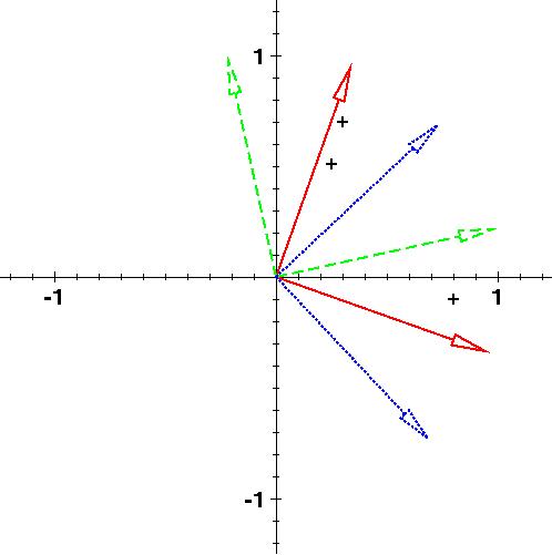 The classical Procrustes problem can be used to find an orthogonal basis for the vectors forming the columns of A. Such an orthogonalization of a basis is associated with the names of Lowdin and Poincare. Unlike the Gram-Schmidt procedure, this basis is democratic in that a permutation of the columns of A yields the same basis vectors - though they may be relabelled. An alternative basis is provided by the V that minimizes the orthogonal Procrustes problem. This basis is also invariant under permutations of the columns of A, but the relaxation of orthonormality allows the basis to be more closely aligned with the original vectors.' The picture illustrates this for 3 two-dimensional vectors (marked with crosses) and the bases found by Lowdin orthogonalization (green), the orthogonal Procrustes problem (red), and the first two left singular vectors of A, (blue) which are also known as the principal components, which are aligned with the directions of greatest variance, though in this two-dimensional example the second principal component is completely determined by the requirement that it be orthogonal to the first. Details of numerical methods for solving the orthogonal Procrustes problem and applications can be found in Orthogonal, but not orthonormal, Procrustes problems. |